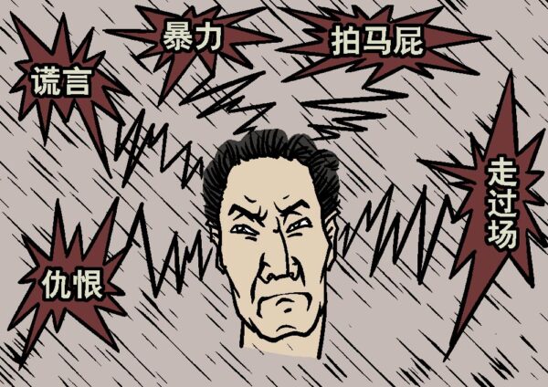 党文化除了深得外来马列邪说之“邪”外,还把中国人几千年来积累的负面因素,如宫廷斗争、结党营私、整人权术、诡诈权谋和共产党宣传的暴力革命、斗争哲学有效地结合起来。在几十年生存危机的挣扎中,不断充实发展和“发扬光大”其“假恶斗”的特征。